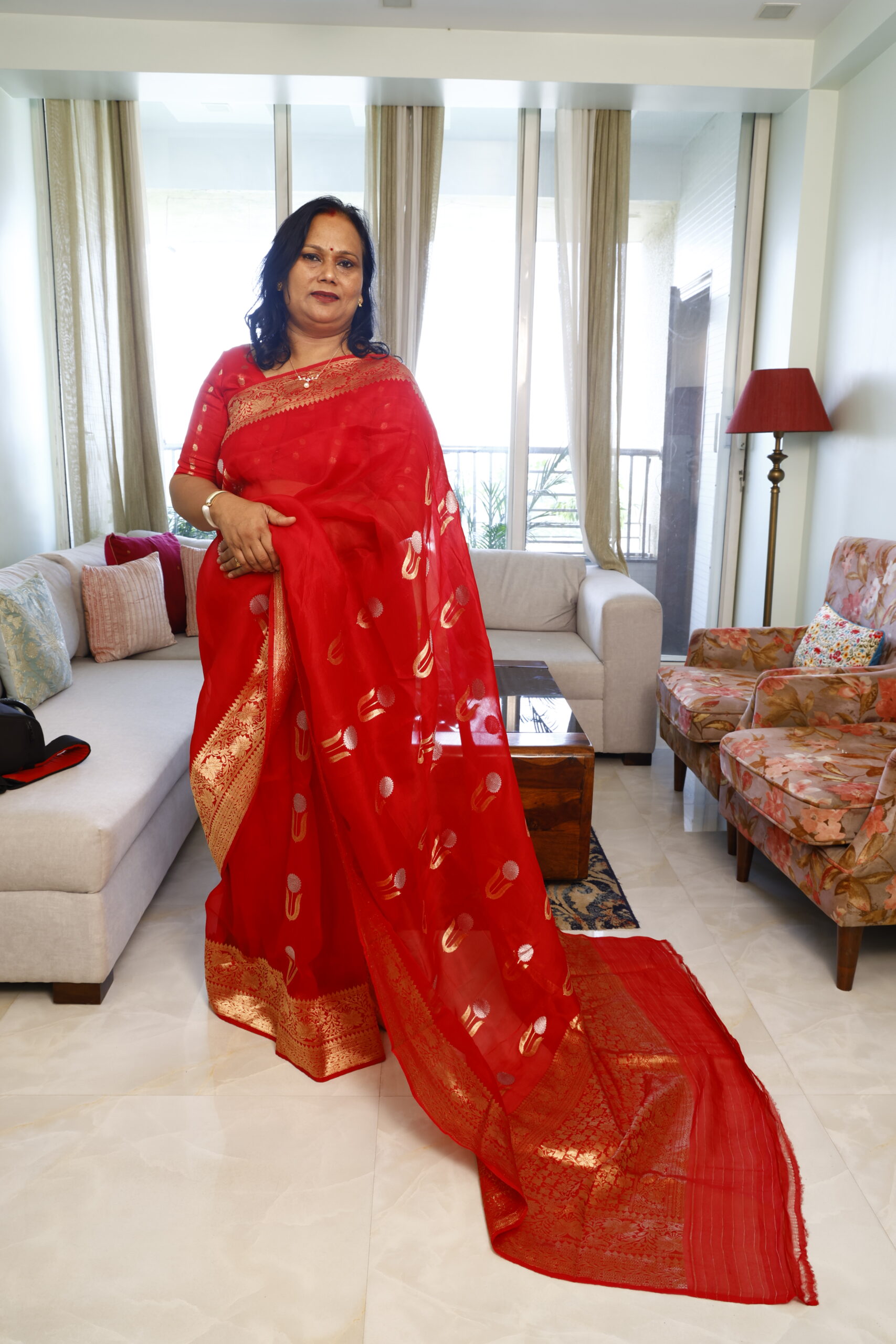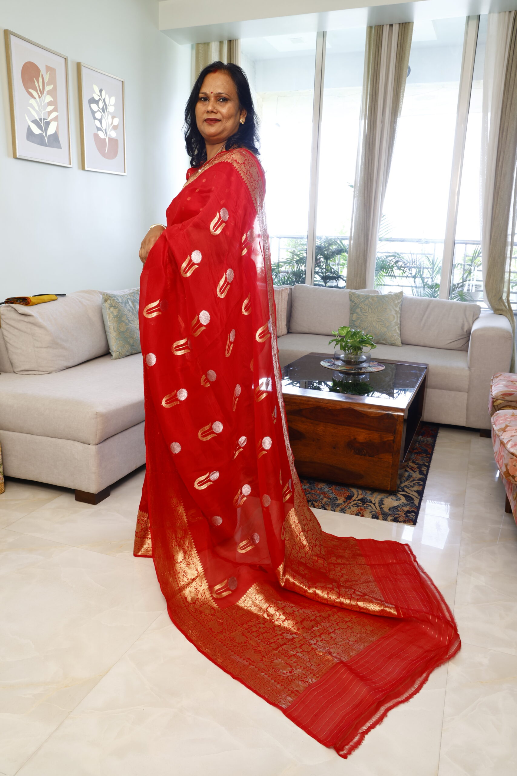 Red Banarasi Organza silk saree beautiful resham motifs with boarder.Crafted with intricate design . These Banarasi sarees are perfect as weeding sarees and festival wear.