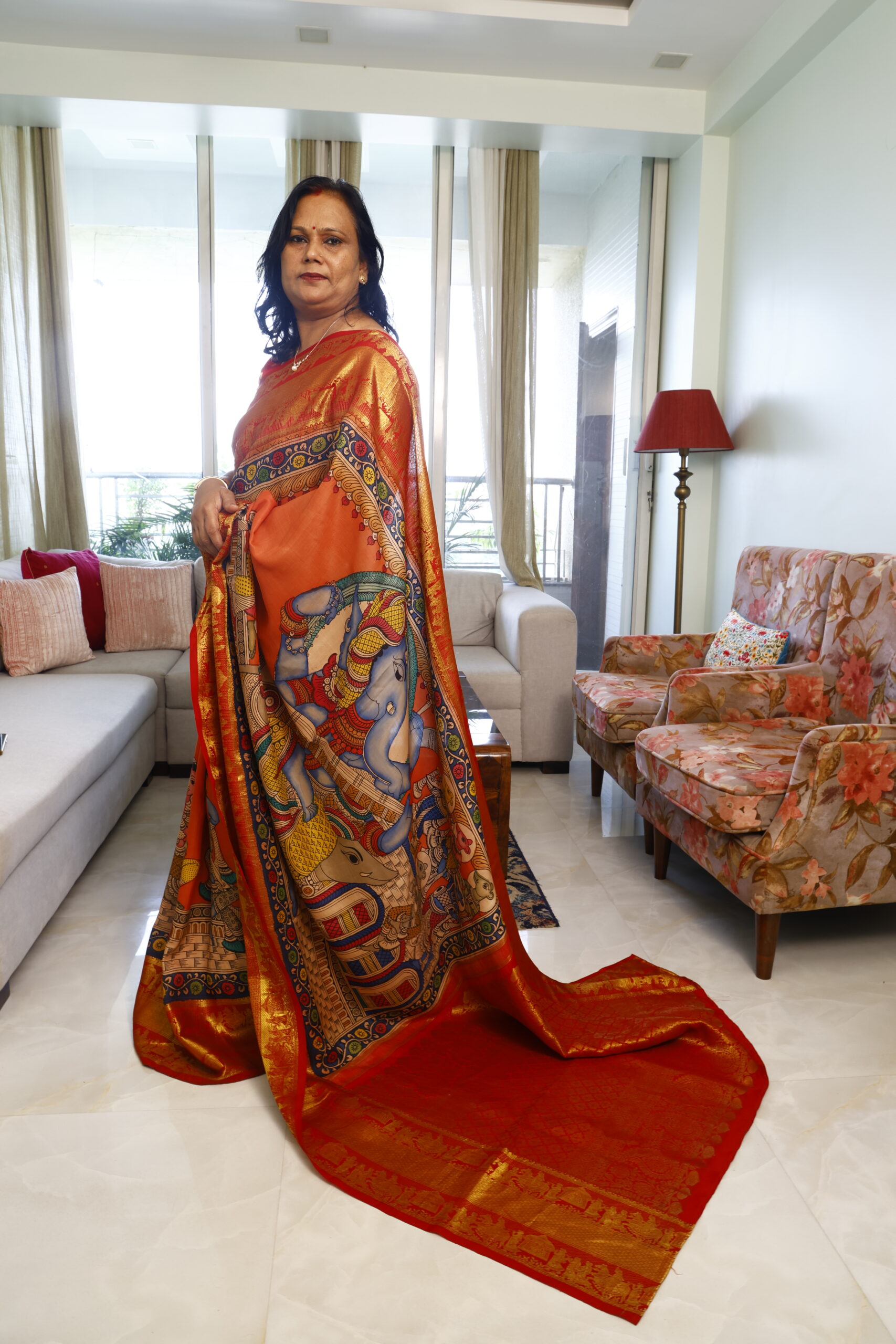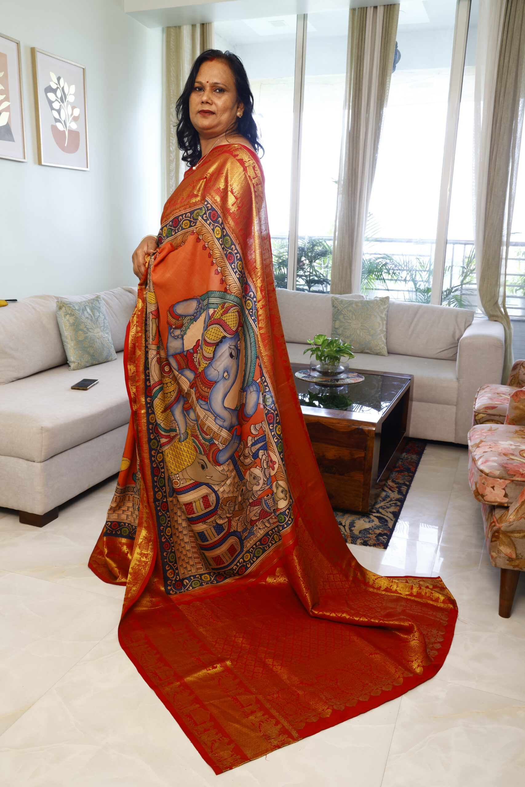 Hand Painted pen kalamkari Kanchi silk saree. Beautiful and authentic piece of hand painted pen kalamkari design on pure handloom weaved Kanchipuram silk saree.